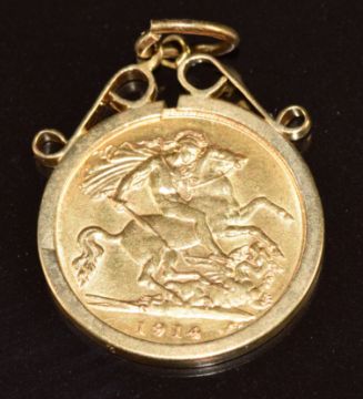 1914 gold half sovereign in 9ct gold pendant mount, 5.4g