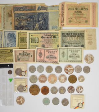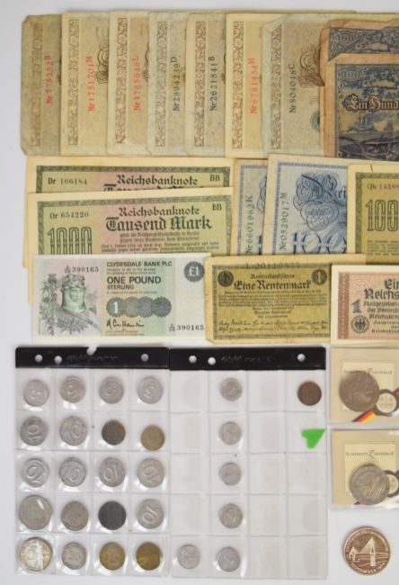 Comemorative and other coins and medals to include 1991 Niue 10 dollar 1994 World Cup 925 silver coin, 31.5g, 1975 Hamburg fine silver thaler, 23.5g, 1963 Kennedy German fine silver  (marked 999) 10g, 1987 Reichstag fine silver (marked 999) 15g,1974 Hamburg bridge and 1975 Elbtunnel 15g silver, 1994 Cook Islands World Cup 5 dollar 10g 500 silver coin, 1977 Max Brauer 30g fine silver medal, 1906 St. Michaelis Kirche zu Hamburg bronze medallion, German coinage including 1939 2 Reichsmark, various 5 Deutschmark pieces, weight of various silver coins 150g, together with a quantity of mainly German inflationary banknotes
