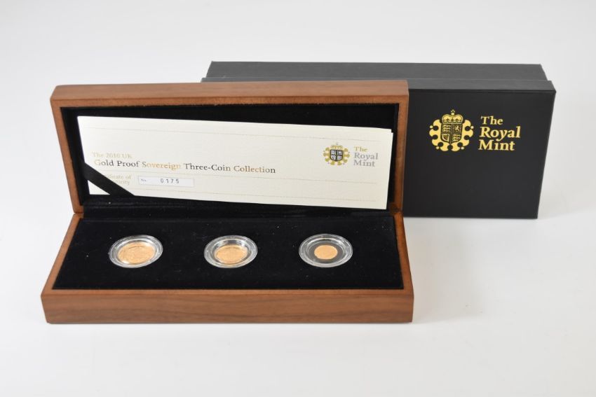 Royal Mint cased limited edition (175/1500) three coin proof 2010 Elizabeth II set comprising one full, one half and one quarter gold sovereign, with Royal Mint certificate
