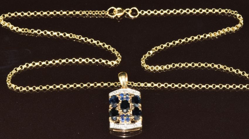 A 9ct gold pendant set with five oval cut sapphires, eight round cut sapphires and diamonds, on 9ct gold chain, 6.7g, 44cm