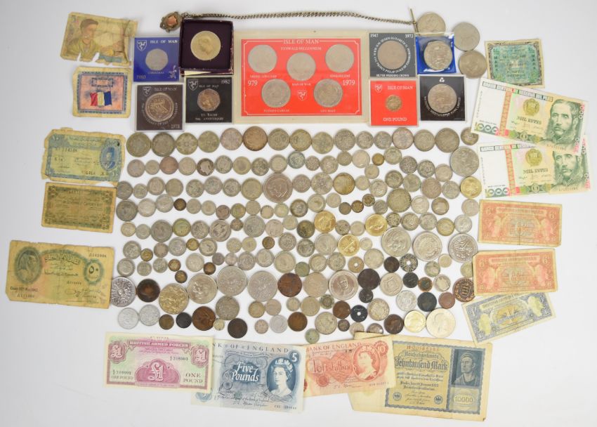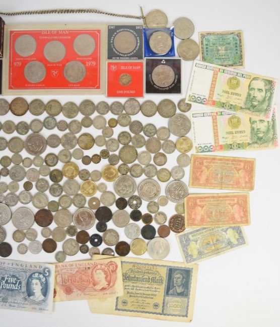 680g Victorian and later pre 1947 silver coinage, hallmarked silver watch chain with Scarborough Motor Club fob, weight 35g, quantity of 19th century and later world coinage including French, Channel Islands, Middle East and Commonwealth together with 25 crowns including Isle of Man Tynwald millennium set, five single metal £2 coins and banknotes including military examples and Fforde £5
