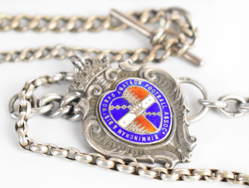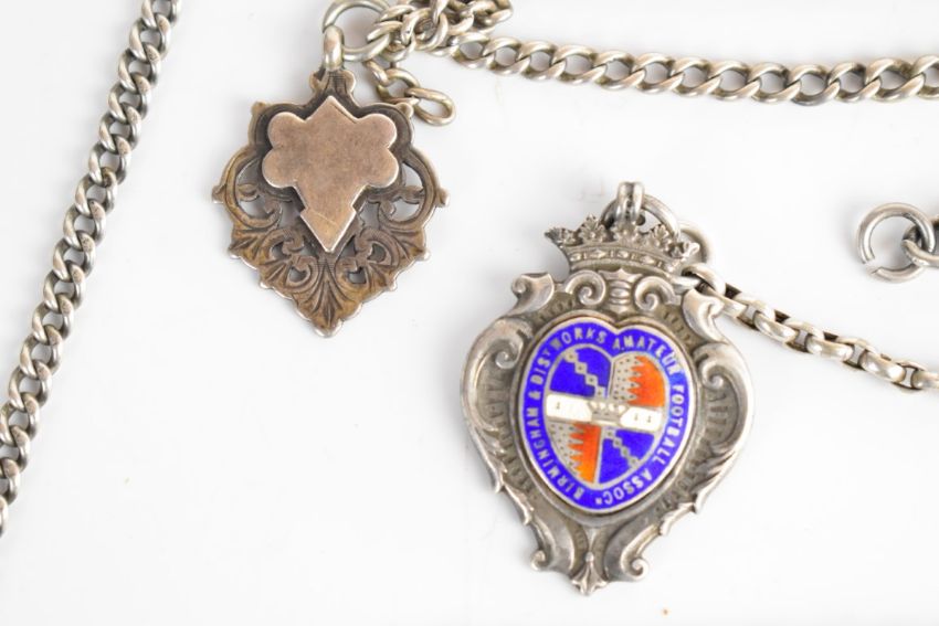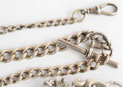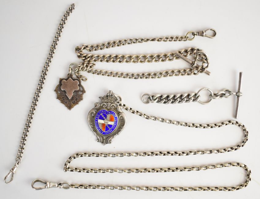 Two silver Albert / watch chains with two silver fobs and two sections of watch chain, 95g