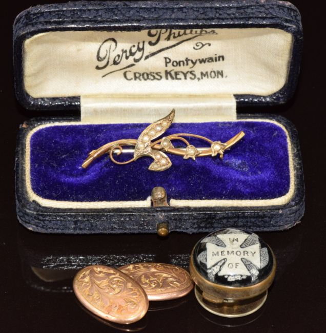A 9ct gold brooch set with seed pearls in antique box, 9ct gold single cufflink (3g) and a Victorian button 'In memory of'