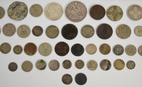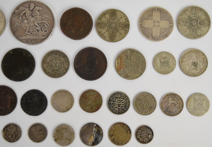 Mainly British coinage to include Edward hammered penny, William III sixpence, Victorian Gothic florin and 1895 crown, together with a small quantity of copper and world coinage, Somerset and Page £1 banknotes and two Ottawa 1986 Canadian notes, approximately 63g pre 1920 and 100g pre 1947 silver coinage