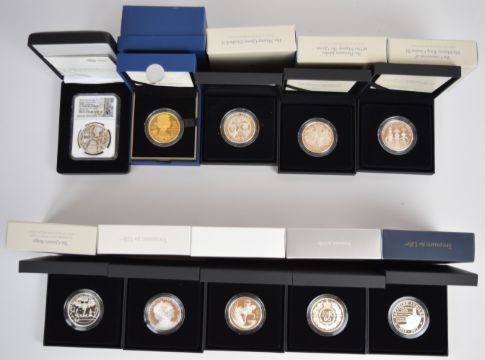 Ten cased limited edition Royal Mint proof £5 silver coins comprising 2023 Coronation, 2022 Honours and Investitures, 2022 Her Majesty Queen Elizabeth II, 2022 Platinum Jubilee, 2029 200th Anniversary of the Birth of Queen Victoria, 2017 Sapphire Jubilee, 2027 Platinum Wedding Anniversary, 2016 90th Birthday of Her Majesty the Queen, 2015 Second Birthday of HRH Prince George of Cambridge and 2012 Diamond Jubilee, all with certificates