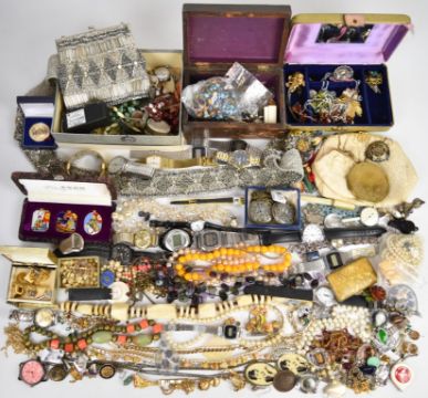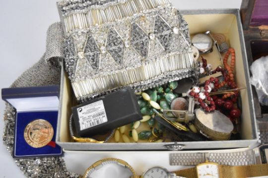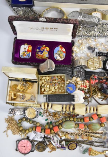 A collection of jewellery including Smith De Luxe watch, Hollywood brooch, 1935 crown, watches, beaded necklaces, silver earrings, coral necklace, Victorian seal, Victorian inlaid tortoiseshell brooch, etc