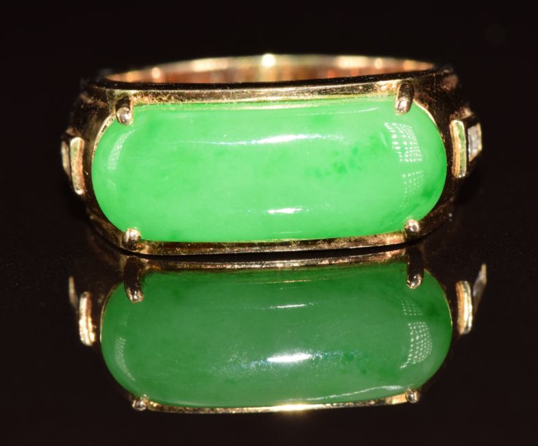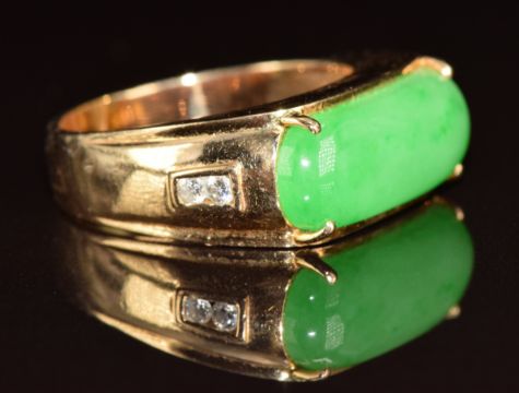 An 18k gold ring set with a jadeite cabochon and two diamonds to each shoulder, 9.5g, size R