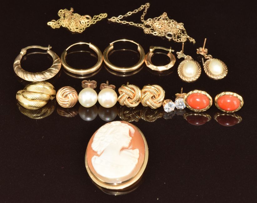 A pair of 18ct gold knot earrings (2.1g), single 18k gold earring (1.3g), three pairs of 9ct gold earrings (3.8g), pair of 18k gold earrings set with coral (1.7g), three single 9ct gold earrings (1.7g) and a 9ct gold brooch set with a cameo