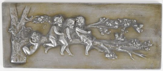 Helmuth Schievelkamp (1849-1936) silver plated Art  Nouveau plaque depicting four puti playing in a tree, signed lower left 10.5 x 25cm