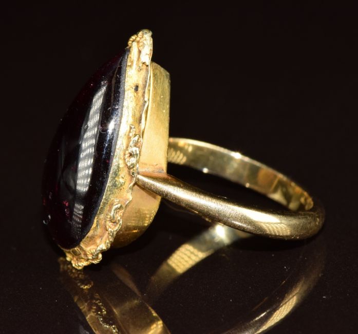 Victorian 9ct gold ring set with a foiled pear cut garnet cabochon, 6.8g, size N