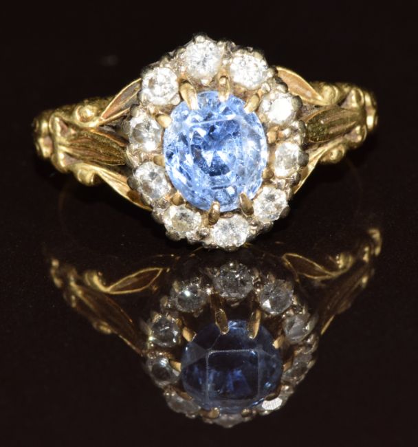 An 18ct gold ring set with an oval cut cornflower blue Ceylon sapphire of approximately 1.8ct surrounded by ten diamonds each approximately 0.04ct, 5.3g, size P