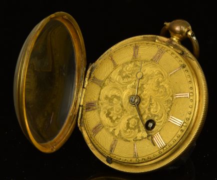 Restell & Son of Tooting gold plated open faced pocket watch with gold Breguet hands and Roman numerals, engraved gold dial and signed movement, case diameter 42mm, serial number 5547, 57g.