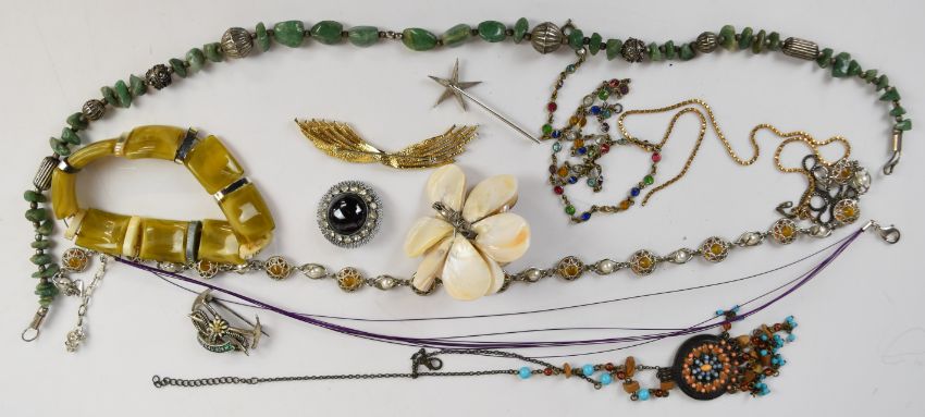 A collection of jewellery including Grome earrings, Monet earrings, silver ring in the form of two ram's heads, silver brooches, turquoise beads, freshwater pearl necklace, Miracle brooch, cultured pearl necklace with 9ct gold clasp, etc