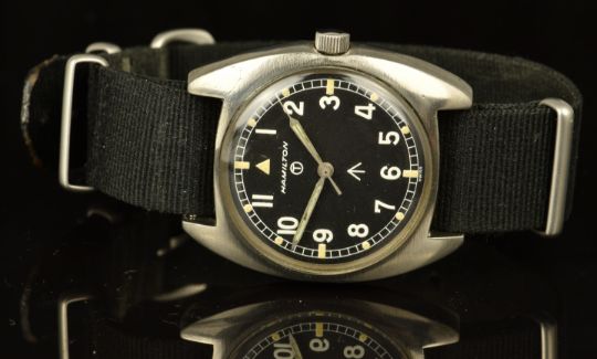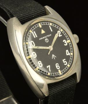 Hamilton gentleman's British military wristwatch with luminous hands and hour markers, white Arabic numerals, railroad minute track, black dial, stainless steel case marked to the back 'W10-6645-99 523-8290 4790/75' around ministry broad arrow and manual winding movement, case diameter 35mm.