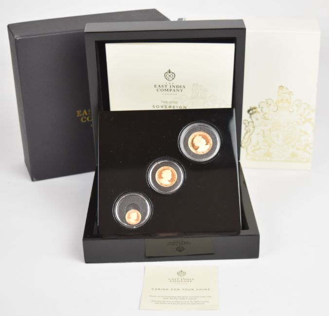 East India Company cased limited edition (104/300) set of three proof 2022 Elizabeth II coins comprising one full, one half and one quarter sovereign, with East India Company certificate