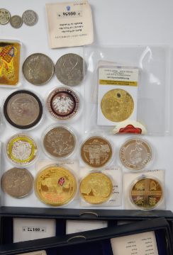 Silver and other coins to include cased Royal Mint 2003 proof silver Britannia collection 20p, Mayfair Coin Company limited edition silver Investiture of the Prince of Wales medallion, two 999 fine silver 20g coins, silver plated and gold plated coins, crowns and replica coins