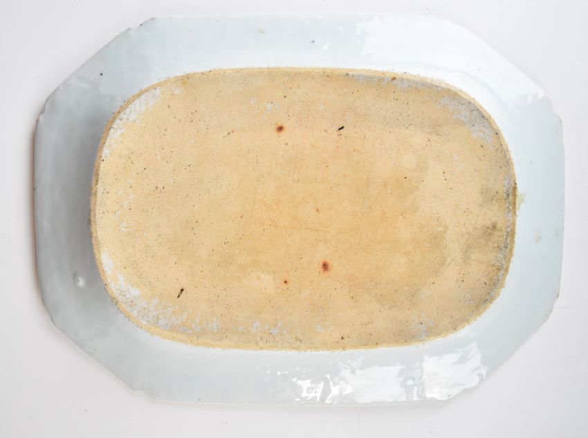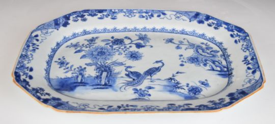 19thC Chinese blue and white octagonal export platter with exotic bird decoration, W32 x H23.5cm