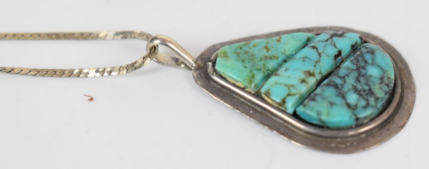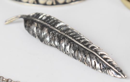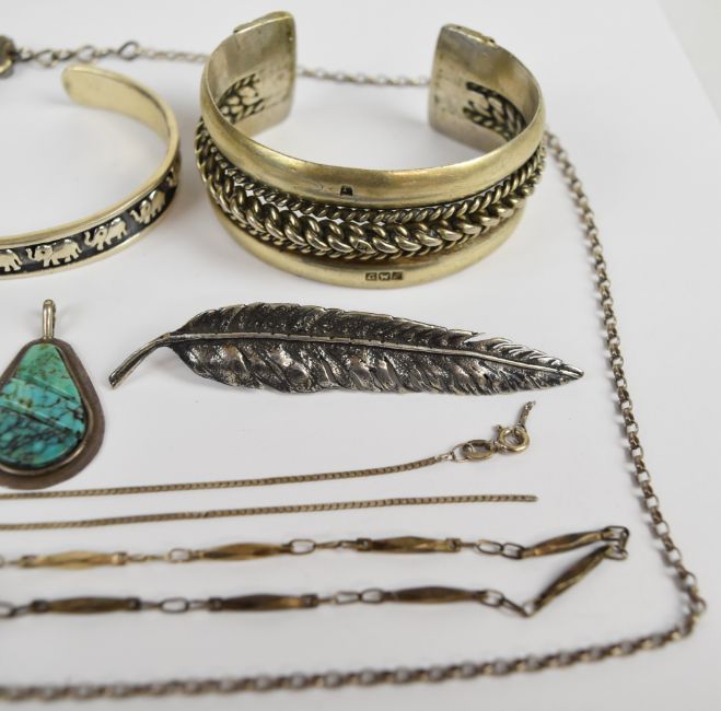 A collection of silver jewellery including three bangles, brooch in the form of three swallows set with turquoise, Navajo pendant set with turquoise, pendant marked Finland RR, Sharmaine Paris brooch, etc