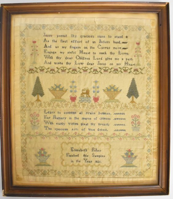 Georgian sampler / embroidery with verse, floral and crested decoration with ornate border and 'Elizabeth Fisher finished this sampler in the year 1821', 38 x 21cm