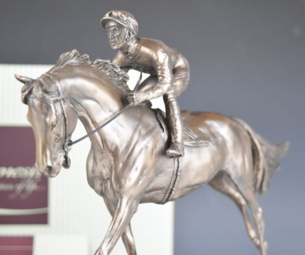 Tim Potts limited edition (of 5000) Genesis bronze coloured study of a horse's head, height 30cm, together with a bronze or similar model of a racehorse and jockey, the former in original box, as supplied to the Cheltenham Festival for use as trophies