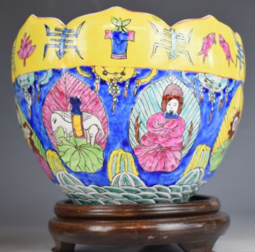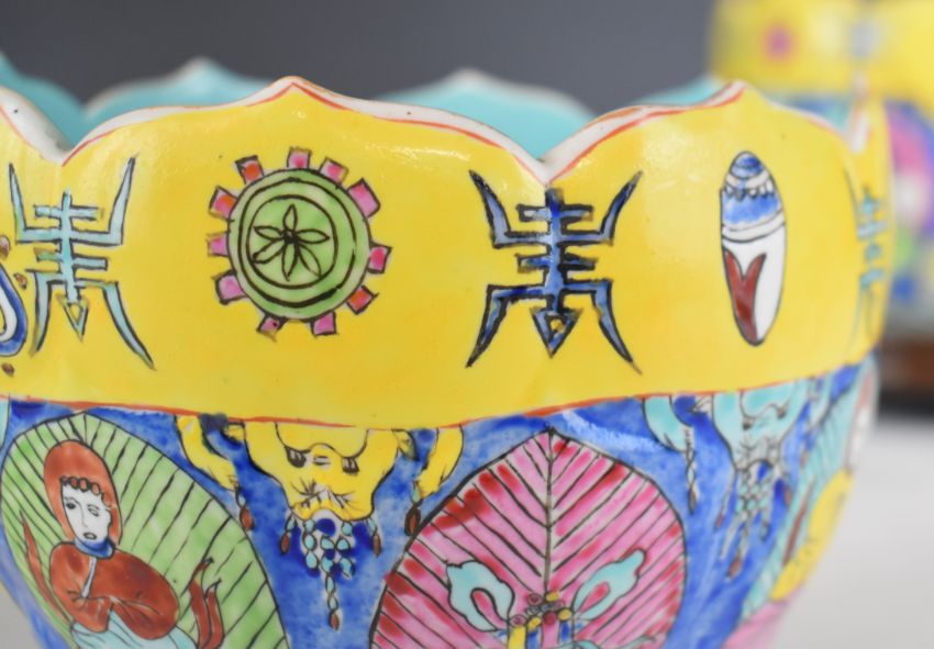 Pair of Chinese pedestal bowls on stands with figural decorations, H12cm