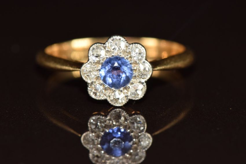 Art Deco 18ct gold ring set with a round cut sapphire surrounded by diamonds, 2g, size I