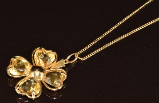 An 18k gold pendant in the form of a four leaf clover set with heart cut citrines (2.5cm) on 18k gold chain, 7.8g, 53cm