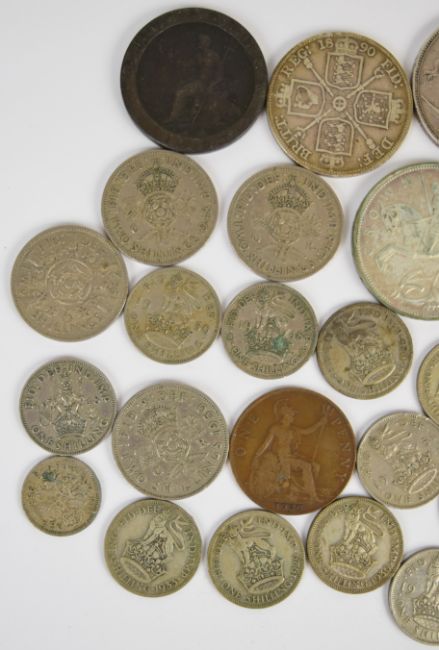 Georgian and later coinage including 1893 and 1898 crowns, 1890 double florin, further 87g pre 1947 coins, cartwheel penny, 1799 George III halfpenny and a boxed Festival of Britain crown