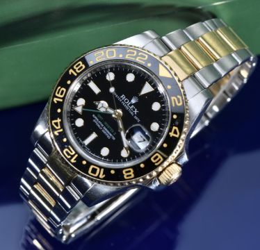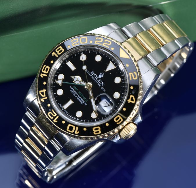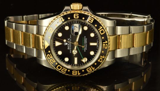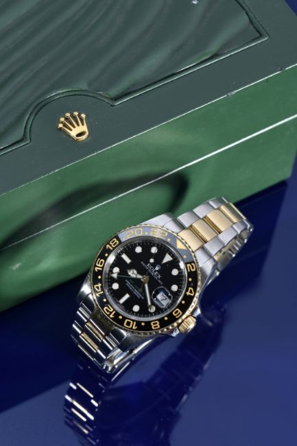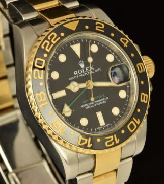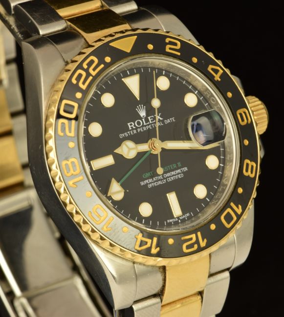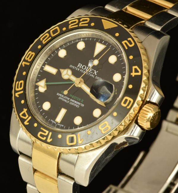 Rolex Oyster Perpetual Date GMT Master II gentleman's automatic wristwatch ref. 116713LN with date aperture, black and gold hand rotating 24 hour bezel, black dial, luminous hands and hour markers, stainless steel case and signed 31 jewel calibre 3186 movement, on bi-metal bracelet, case diameter 40mm, serial number 1QK30337, in original box with guarantee card and purchase receipt.