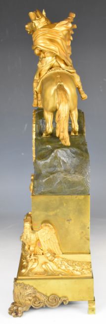 19th century French mantel clock surmounted by a gilt model of Napoleon on his horse, named to the dial Binet Jacquet Caen, the two train movement marked Gaborit Paris and striking on a bell, overall height 45.5cm