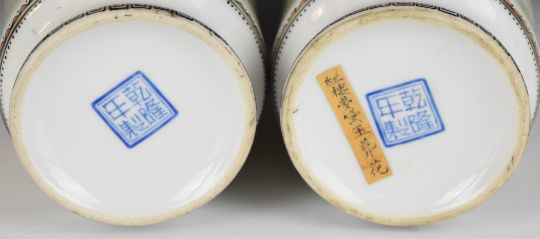 Pair of 20thC Chinese vases with figural decoration, script verso, marks and paper label to base, H28cm