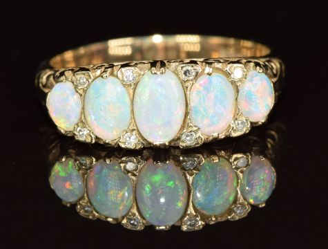 A 9ct gold ring set with five opal cabochons and diamonds, 3.8g, size O
