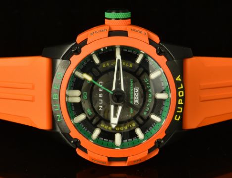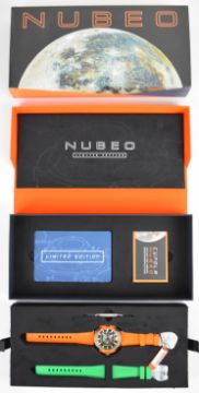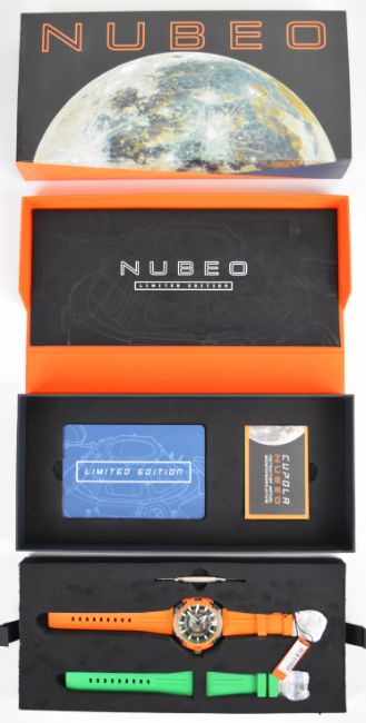 Nubeo Cupola Skeleton Mandarin gentleman's automatic wristwatch ref. NB-6055-02 with luminous hands and hour markers, skeleton dial, clear exhibition case back, orange and black stainless steel case and 24 jewel movement, on orange rubber strap, case diameter 50.5mm, limited edition 129/600, unworn in original case with green strap, guarantee card, related paperwork, tool, hang tag and outer card sleeve.