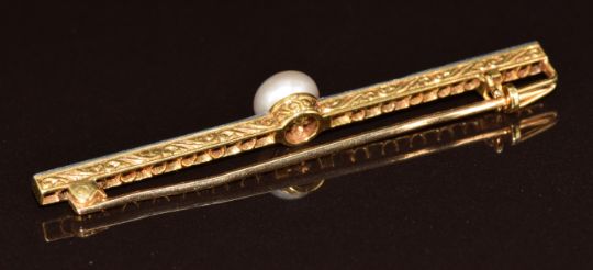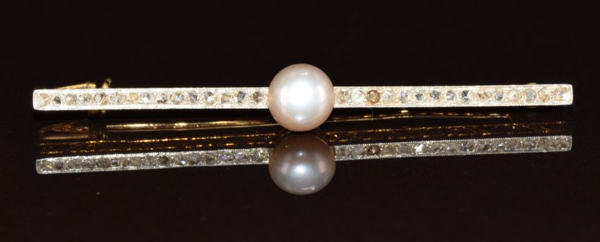 A yellow metal c1900 brooch set with a pearl and rose cut diamonds, 4.1g, 5cm