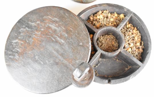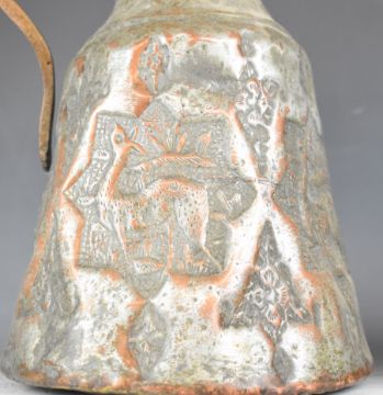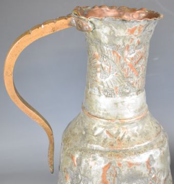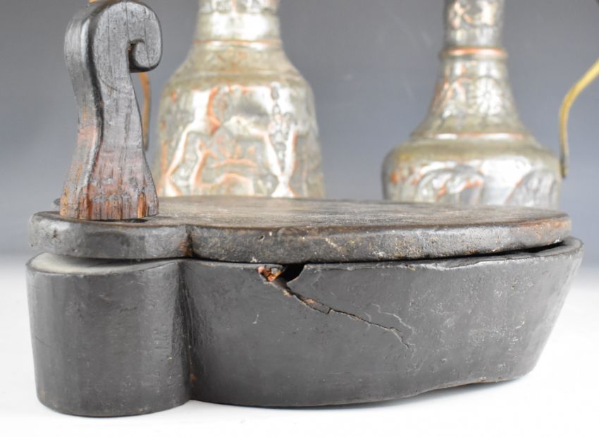 Indian wooden spice box with fitted interior and swivel lid and two Eastern pitchers, tallest 36cm