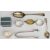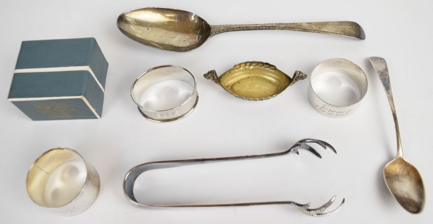 Hallmarked silver items comprising three various napkin rings, bottom hallmarked feather edged table spoon, Georgian teaspoon, Norwegian 830 grade silver longship salt and a pair of silver plated claw shaped sugar tongs, weight excluding tongs 142g