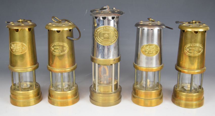 Five miner's lamps including Thomas and Williams, Cambrian, Lamp and Limelight Company etc, and a miniature model diver's helmet, tallest 22cm