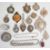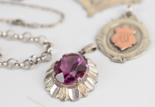 Eleven silver fobs, two Edwardian silver brooches, silver chain, silver pendant, etc