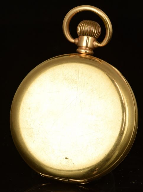 Waltham 14ct gold plated keyless winding open faced pocket watch with subsidiary seconds dial, ornate gold hands, black Roman numerals, white enamel dial and signed and engraved movement, case diameter 50mm, serial number 15767067.