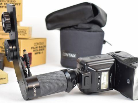 Contax 645 medium format camera outfit, serial number 009498, with Zeiss Planar 2/80 T* lens, with Hoya filter, GB-71 hood, Contax lens cap, MP-1 battery holder, LA-50 cable switch, MFB-1 film back and and extra MFB-1A film insert, NCL-1 soft lens case, MF-2 waist level finder, MF-1 prism finder, MFS-2 focusing screen, Polaroid MFB-2 back, TLA 360 flash, PS-220 power pack, SMB-1 flash bracket and boxes for film back, insert, cable switch and lens hood