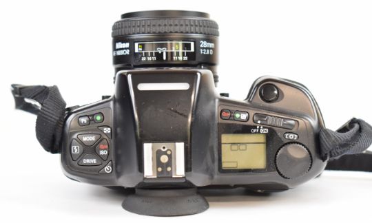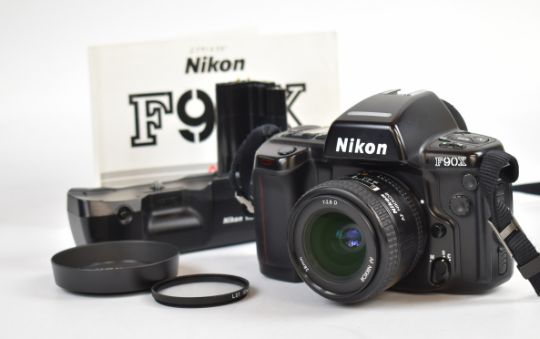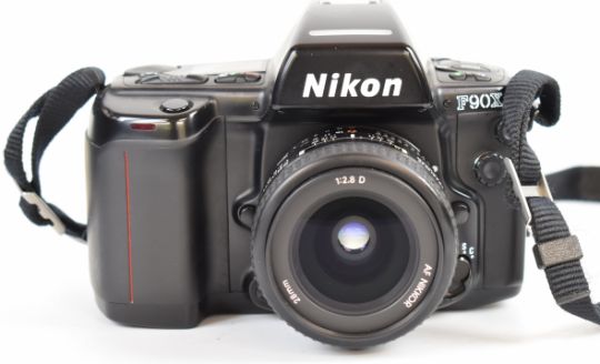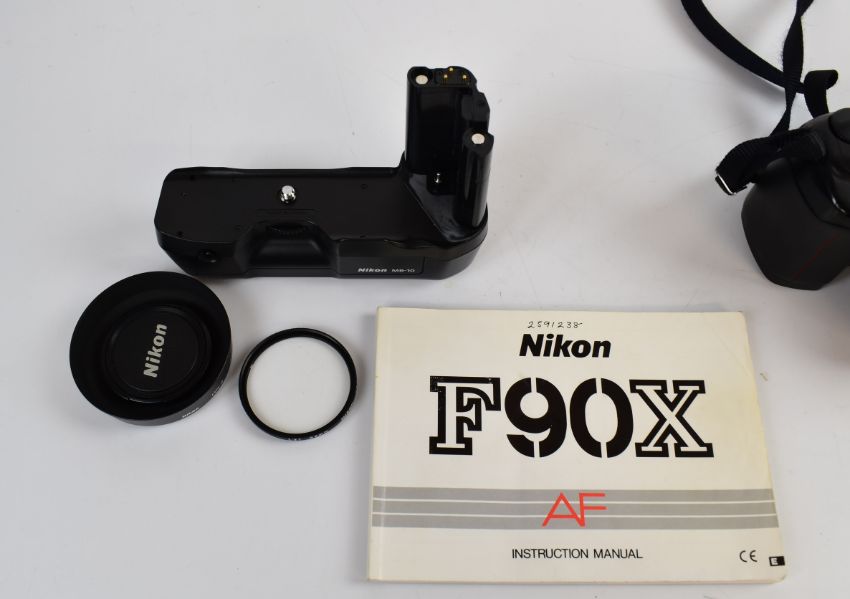 Nikon F90X 35mm SLR camera, serial number 217914, with AF Nikkor AF 28mm 1:2.8 D lens, serial number 455271, with HN-2 hood, L37 filter, lens cap, MF-26 back and MB10 battery