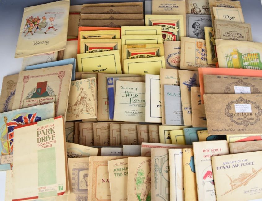 Extensive collection of cigarette cards mostly in their completed albums includes Churchman, Ogden's, Wills, Player's, Cavanders, Kensitas, Gallaher, Godfrey Phillips, Piccadilly, Park Drive and Carreras the completed albums include Tennis, Motor Cars, Boy Scouts and Girl Guides, Film Stars, Aviary and Cage Birds, Speed, In Town To-night, Horsemanship, Gilbert & Sullivan, Fire Fighting Appliances, Characters from Dickens, Railway Engines, Cycling 1839-1939, Dogs (several), R.A.F. Badges, Bird Eggs, Famous Minors, Railway Equipment, Arms of the Bishoprics, Foreign Birds, Arms of Foreign Cities, Ship's Badges, Kings of Speed, Children of All Nations, Modern Naval Craft, Air Liners, Cricketers, Aeroplanes (civil), Royal Air Force, Horsemanship, Fresh-water Fishes, Famous Jockeys, Champions, Navy, Popular Personalities, Film Episodes, Territorial Army, Military Uniforms etc, together with Kensitas Album of National Flags (printed on silk) and Kensitas comical albums of Henry (first and second series) with trade card catalogue (approximately 100 sets / albums)