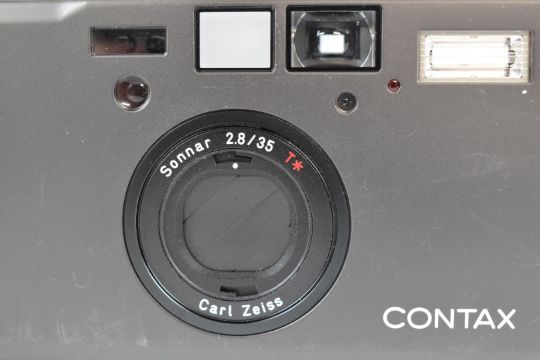 Contax T3 compact titanium 35mm rangefinder camera, serial number 021843, with Zeiss Sonnar 2.8/35T* lens, 30.5 adaptor, metal hood and two 30.5mm filters in original boxes and an instruction manual for the camera