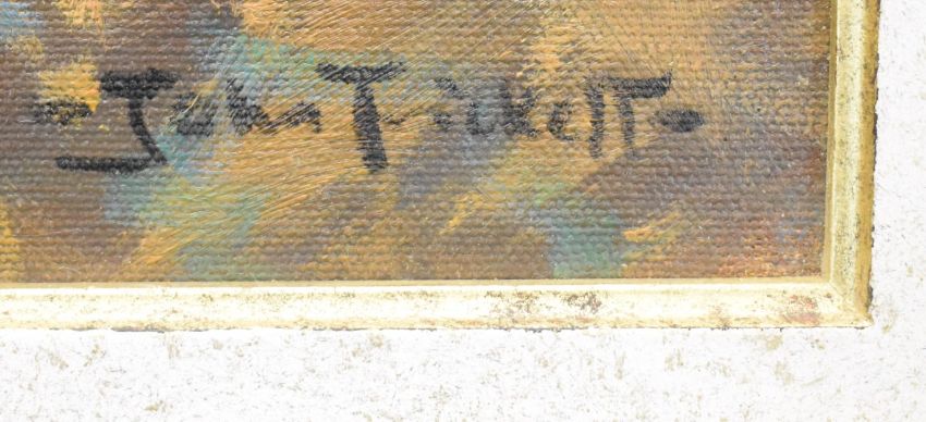 John Trickett (b1952) oil on canvas spaniel flushing a cock pheasant from bracken, label verso, 49 x 40cm