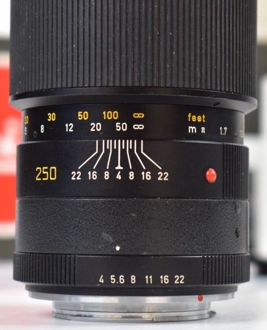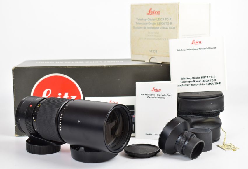 Leitz Telyt-R R mount 1:4/250mm lens, serial number 3076013, circa 1980, with front and rear covers and telescope ocular to Leica R, both in original boxes