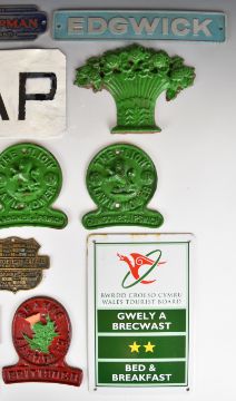 Collection of cast metal, enamel and other advertising and opticians signs including Ransomes Cub, Shanks Arbroath, The Lion Lawnmower, Hurst Nelson Motherwell etc., largest 26 x 17cm