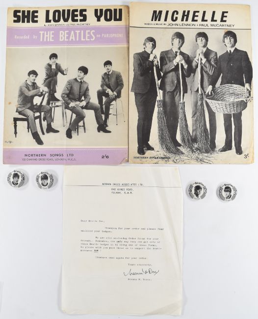 Set of four vintage Beatles badges, together with letter from Norman Drees Associates Ltd, 642 Kings Road, Fulham, SW6, thanking the Beatle Fan for their order and enclosing (no longer present) a form, being the only way to obtain the badges, and sheet music for She Loves You and Michelle