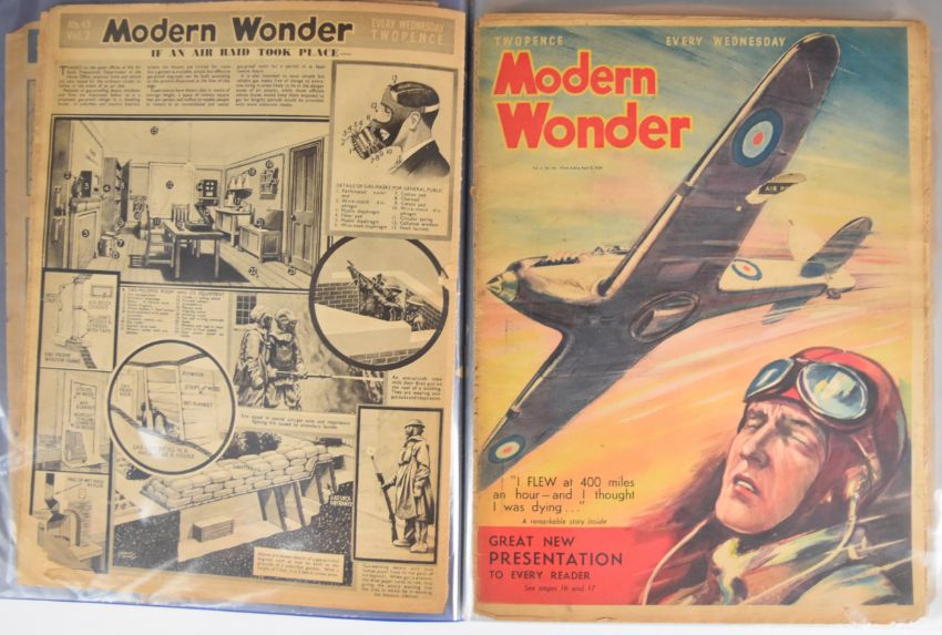 Illustrated London News Coronation Panorama Number 1911. Modern Wonder (magazine) comprising 20 issues published 1938 (fighting air raiders, empire exhibition Glasgow, monster of the Algerian railway, King Solomon’s mines, Cheltenham Flyer, Whitley Bomber etc). War Atlas, section of The Philadelphia Inquirer Feb. 13 1942 with map. Kessler’s racing print 1873. Animal Stories book (1920s). Set of Wills Air Raid cigarette cards (50). Antique Poetry booklet (1900). Gilbert Wilkinson comic book (from Daily Herald) Colour decorated telegrams from 1940s