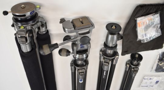 Seven Gitzo carbon fibre tripods comprising G1128 Mk2 with G1372M head, GT1940 with G1177M head, G1228 with G1276M head, GT3541XLS with bubble ball head, G1548 Mk2 with G1572, G1325 Mk2 with G1321 head and G1028, two having bags