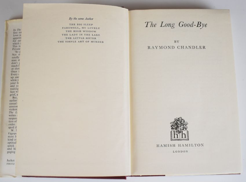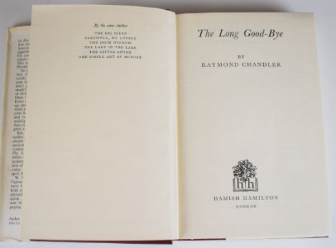 Raymond Chandler The Long Goodbye published Hamish Hamilton 1953 first edition, bound in publisher's cloth with silver lettering, in original colour illustrated dust-wrapper (price-clipped wrapper is slightly worn at extremities – name dated 1954 on free endpaper), being the last of the full length novels with detective Philip Marlowe, winner of the Edgar Award for Best Novel in 1955 and afterwards adapted into a film. The UK edition, offered here, precedes the first US edition